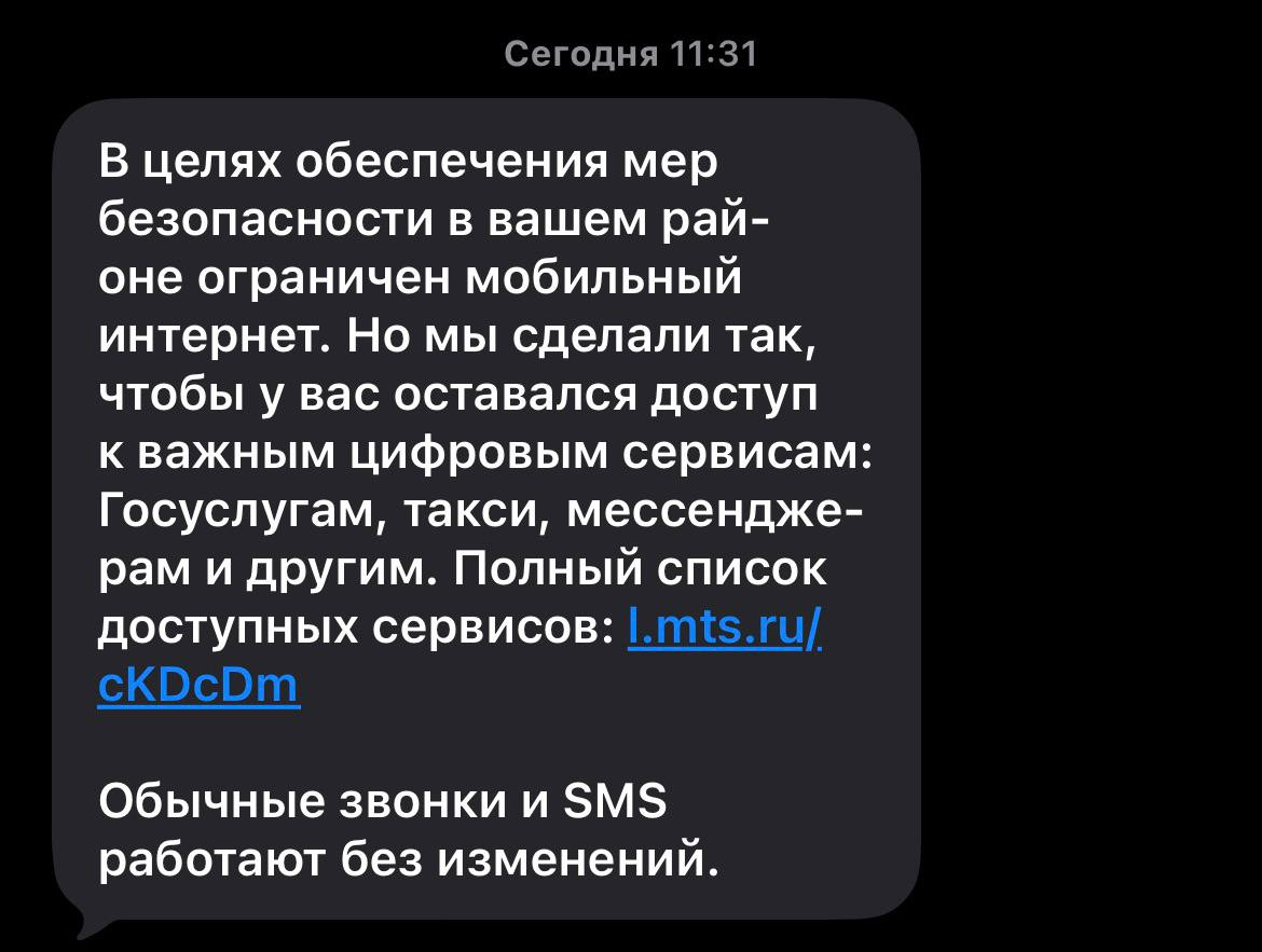 К слову, сегодня сотовые операторы начали присылать жителям района смс-оповещения об ограничении мобильного интернета в целях безопасности. В частности, такое сообщение получили абоненты МТС.