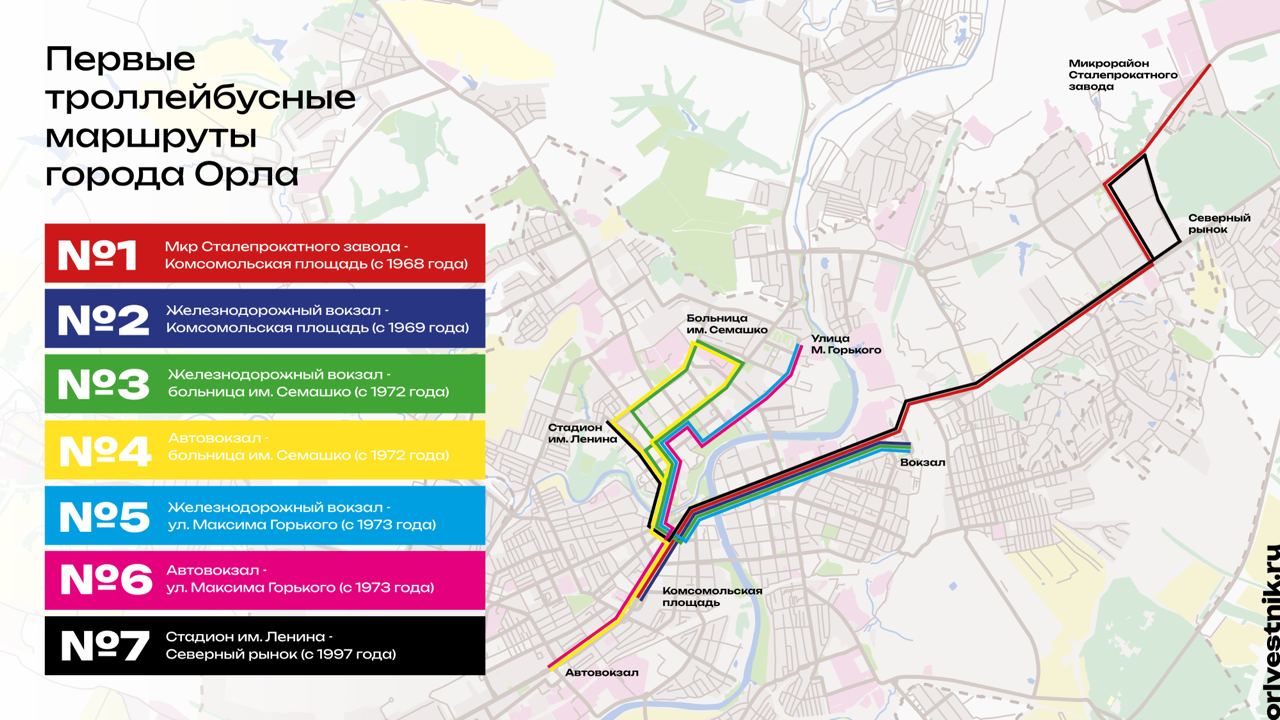 День Х для орловского троллейбуса настал 29 октября. Тогда в свой первый пассажирский рейс вышел ЗИУ-05. Маршрут начинался от микрорайона сталепрокатного завода и тянулся до Комсомольской площади. Поначалу горожане опасались удивительной рогатой машины, однако быстро оценили предлагаемые комфортабельные условия перевозки. Линия начала работать и разгружать часы «пик». Уже через пару лет маршрут продлили с обоих сторон. Троллейбус курсировал от СПЗ до автовокзала. В 69-ом запустили маршрут №2 «Автовокзал - Вокзал», а к 1971-му троллейбусы пошли в Советский район до больницы имени Семашко. В январе 1973-го в город прибыли более современные модели ЗиУ-9. К концу года ввели талонную систему оплаты проезда в электротранспорте.