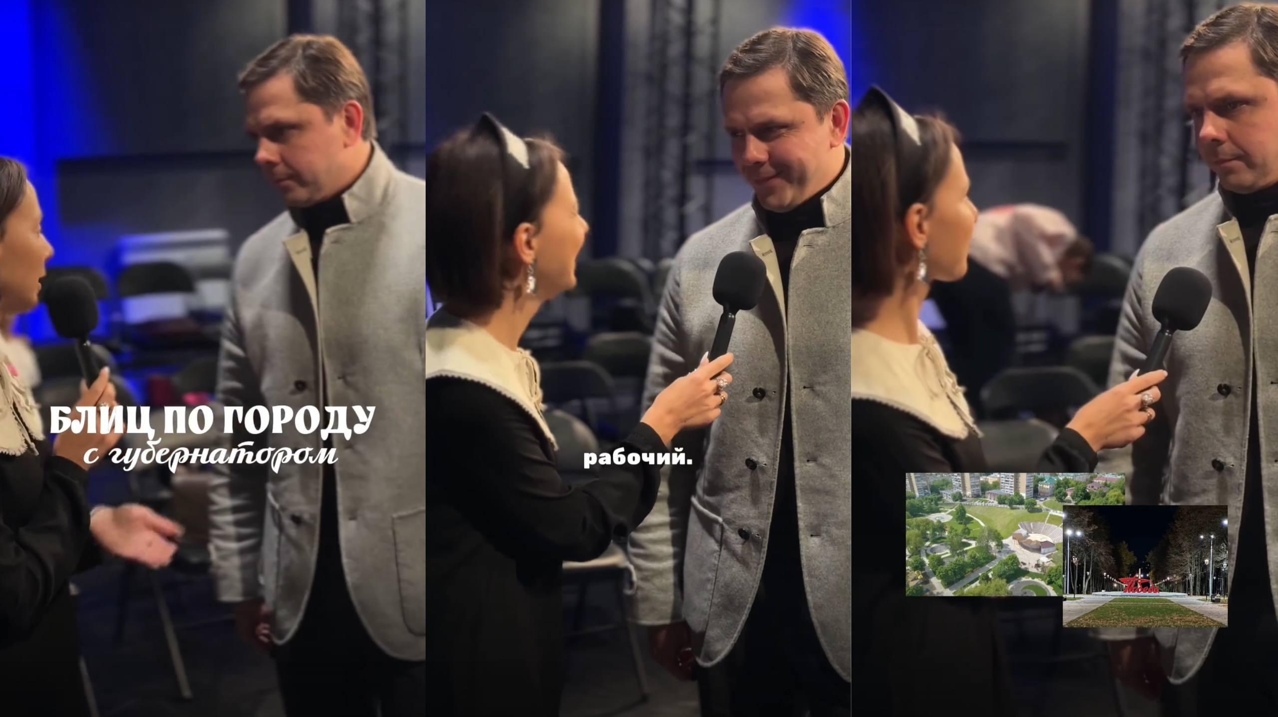 Девушка предлагают выбрать наиболее привлекательное на его взгляд место в городе. Среди них Детский и Городской парки, а также парк Победы и новогодняя площадь Ленина. В результате блица губернатор отметил, что площадь под Новый год, конечно же, лучше.