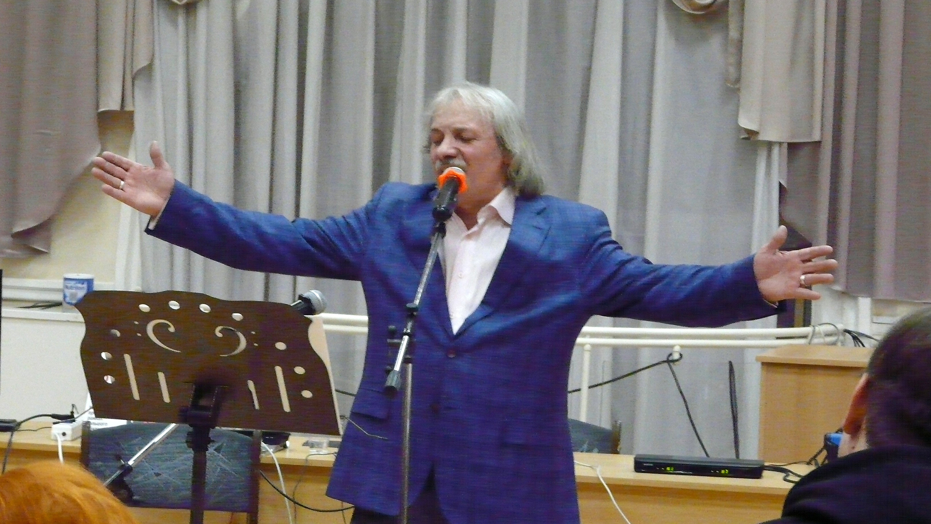 Маэстро вышел к микрофону, попросил помощника включить нужную аудиодорожку и тут же исполнил песню на стихи свой жены Любови Сорочьевой «А в переулке ягодном». Под тёплый звон струн прозвучали романтичные строки о прошлом, настоящем, будущем и, конечно, о родном городе Орле: