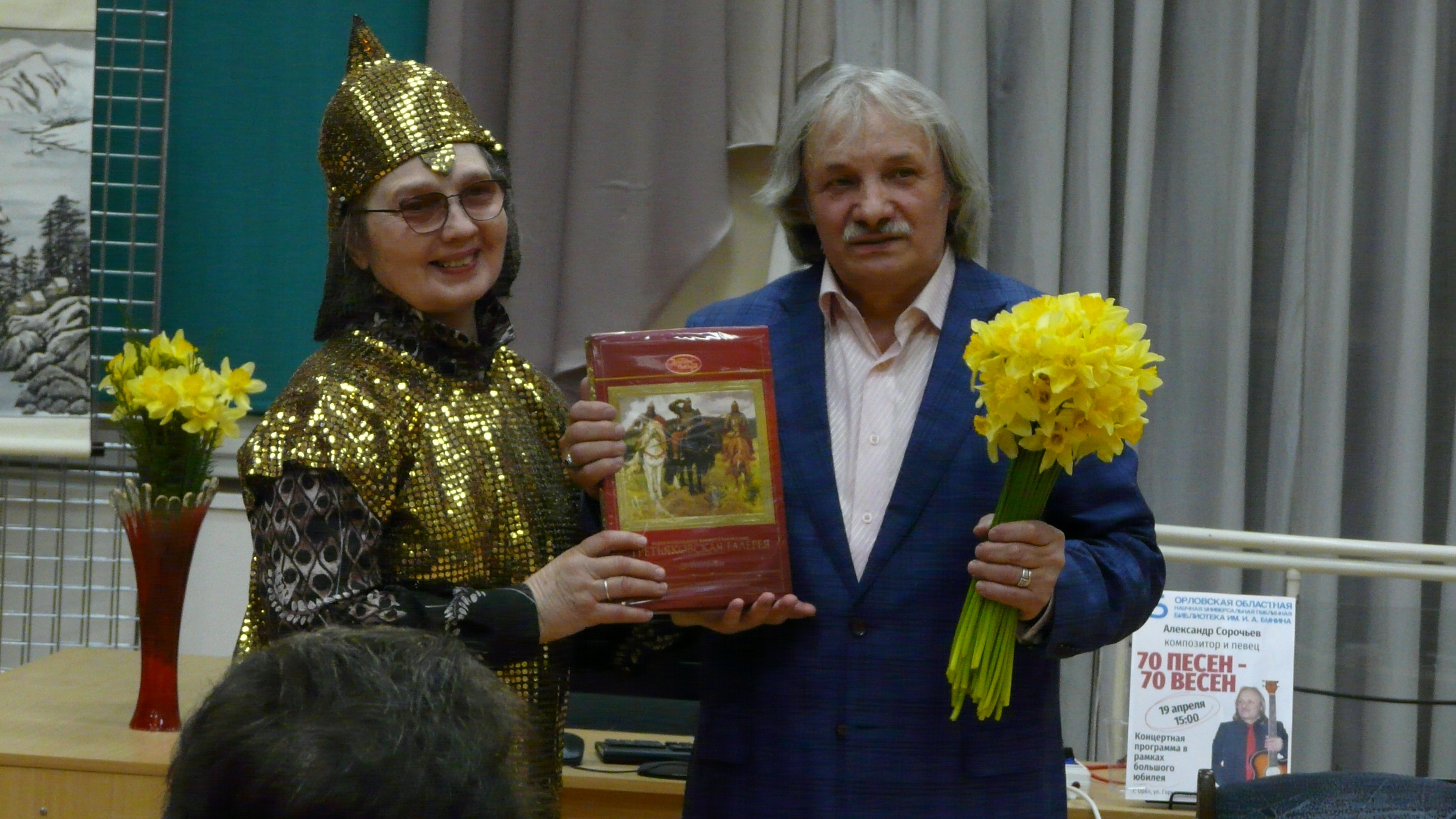 Заслуженный работник культуры Александра Семёнова очень спешила на важное мероприятие, но не могла преминуть поздравлением и перед уходом а-капелла спела для коллеги. А поэтесса Елена Семёнова, облачённая в необычный костюм, прочитала «Русь» И. С. Никитина и пожелала товарищу богатырского здоровья и вручила солнечно-жёлтый букет нарциссов.