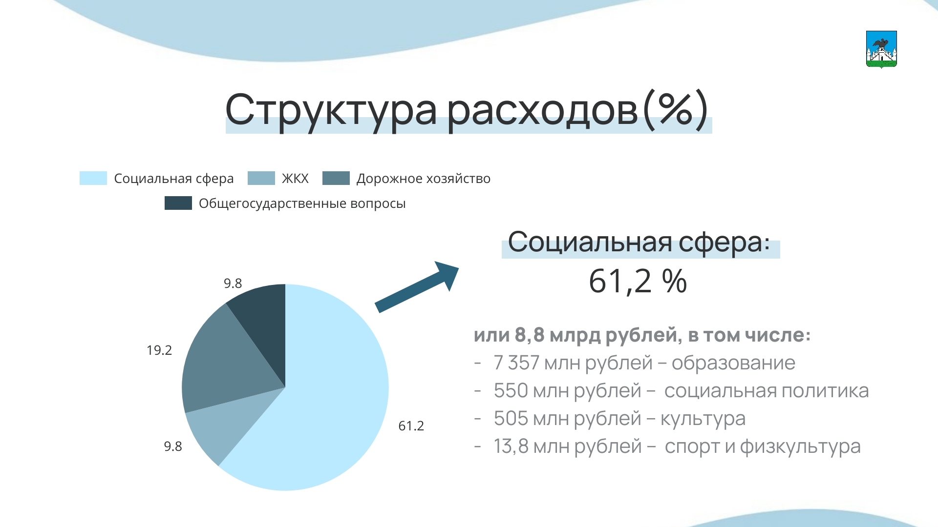 Безвозмездные поступления из вышестоящих бюджетов составили 9,6 млрд рублей. Эти средства позволили реализовывать проекты дорожного строительства, коммунальной инфраструктуры и благоустройства.