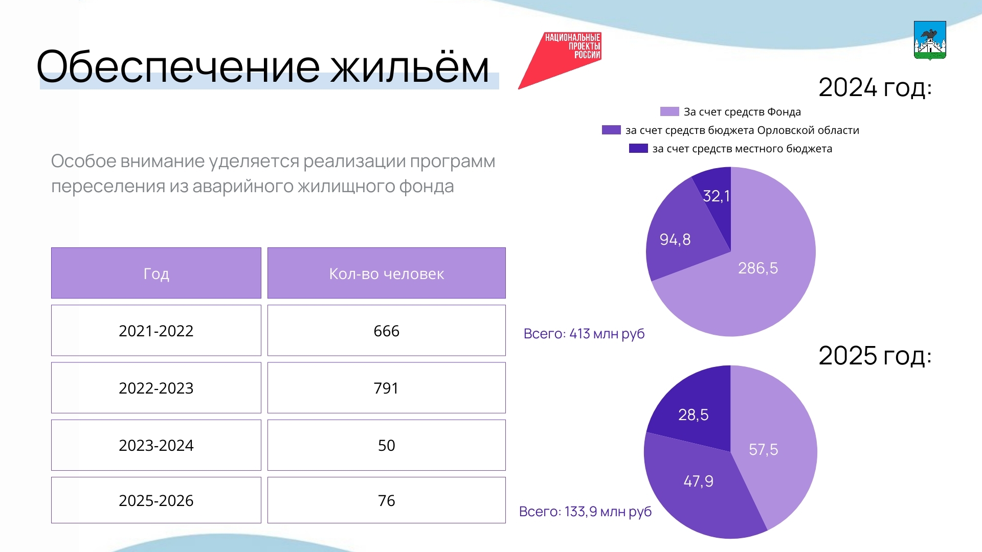 В 2025 году Орел участвовал в реализации четырех национальных проектов. «Семья», «Молодежь и дети», «Туризм и индустрия», «Инфраструктура для жизни». Общий объем финансирования составил почти 2 млрд рублей, из которых 1 млрд 256 млн – это средства из вышестоящих бюджетов.