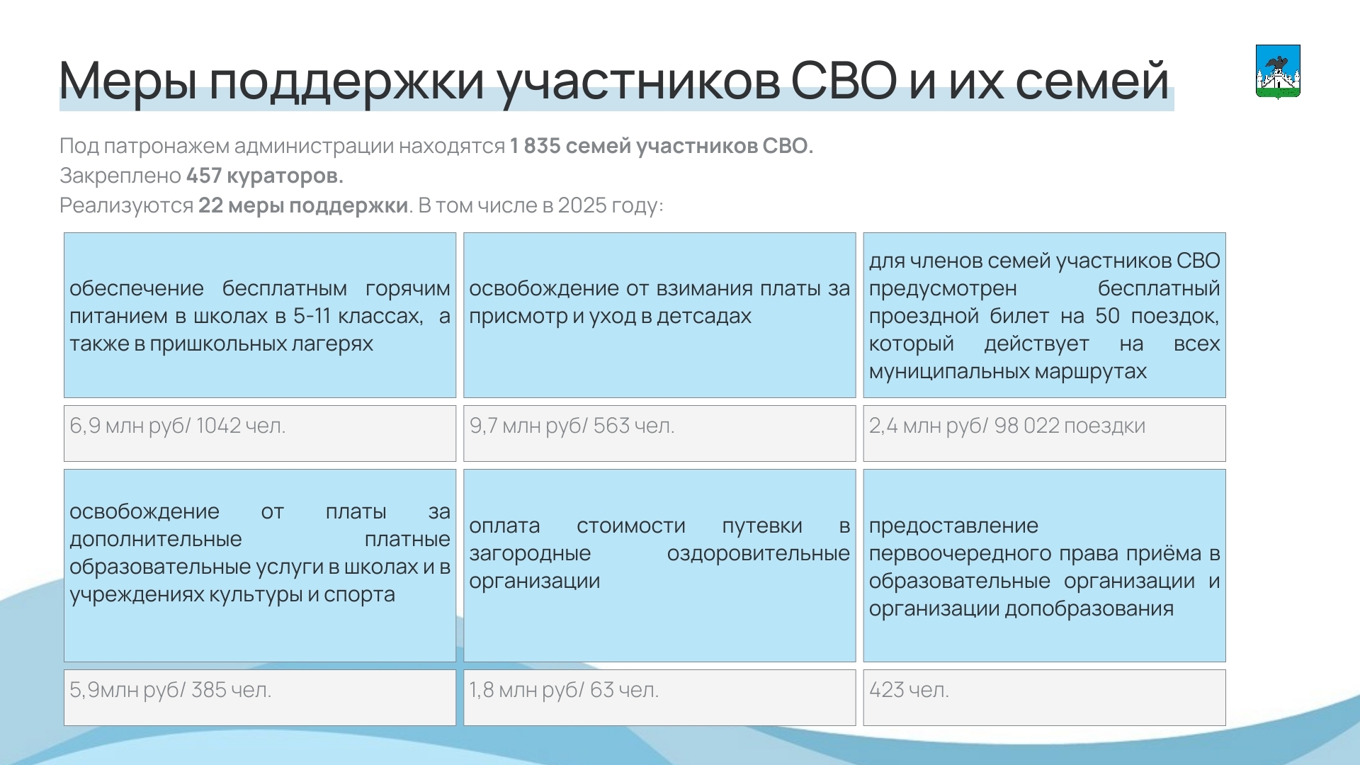 Под патронажем сотрудников городской администрации находится 1835 семей участников специальной военной операции. За ними закреплены 457 кураторов. Реализуется 22 меры поддержки. Бесплатным школьным питанием обеспечены 1042 ребенка бойцов СВО. 563 ребенка освобождены от платы за детский сад.