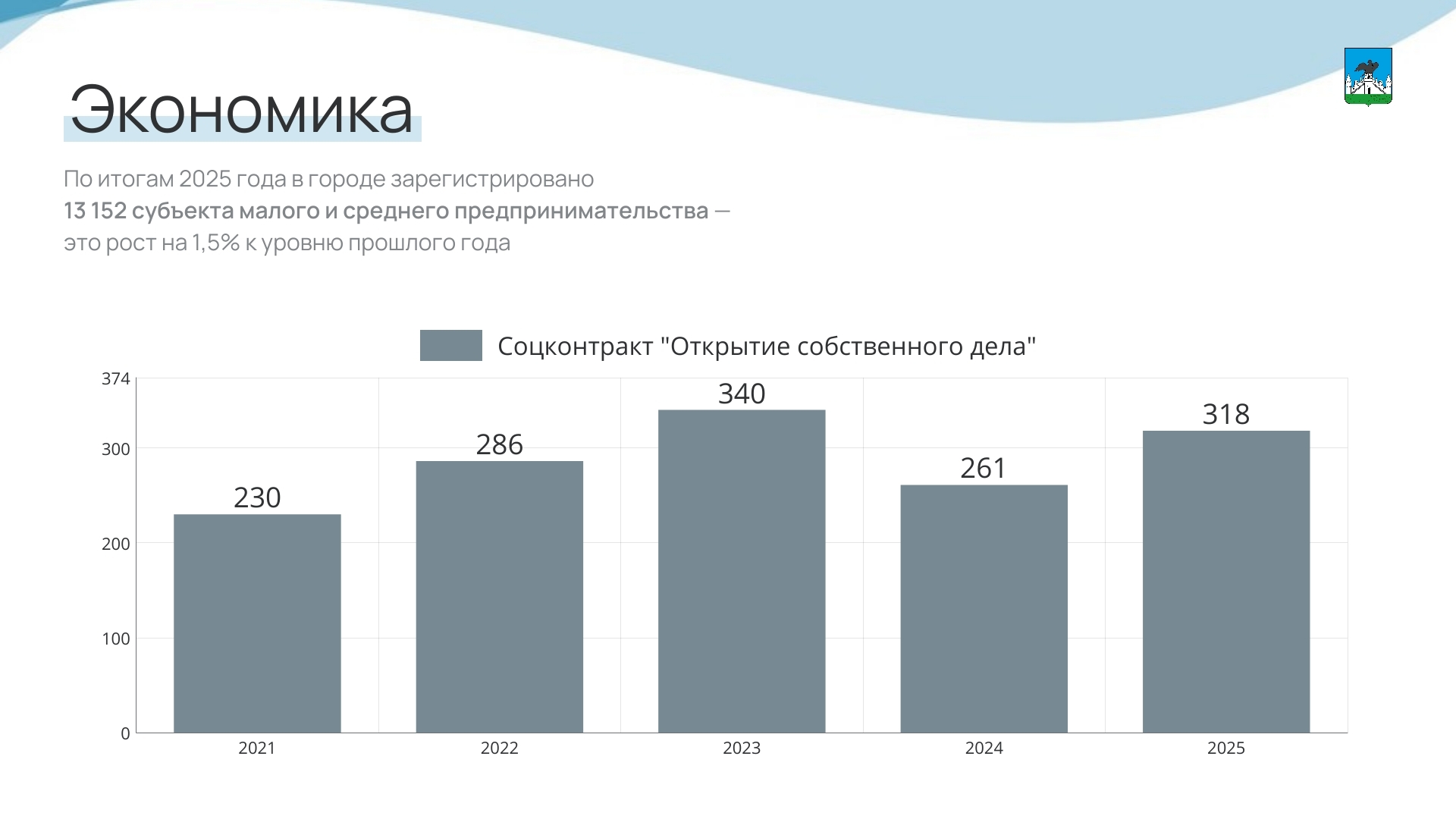 Несмотря на внешние вызовы, Орел сохраняет «деловую армию». По итогам 2025 года в городе зарегистрировано 13 152 субъекта малого и среднего предпринимательства. Рост составил 1,5% к уровню прошлого года. Заключено 628 социальных контрактов на сумму свыше 150 млн рублей. Это позволило создать и сохранить порядка 900 рабочих мест.
