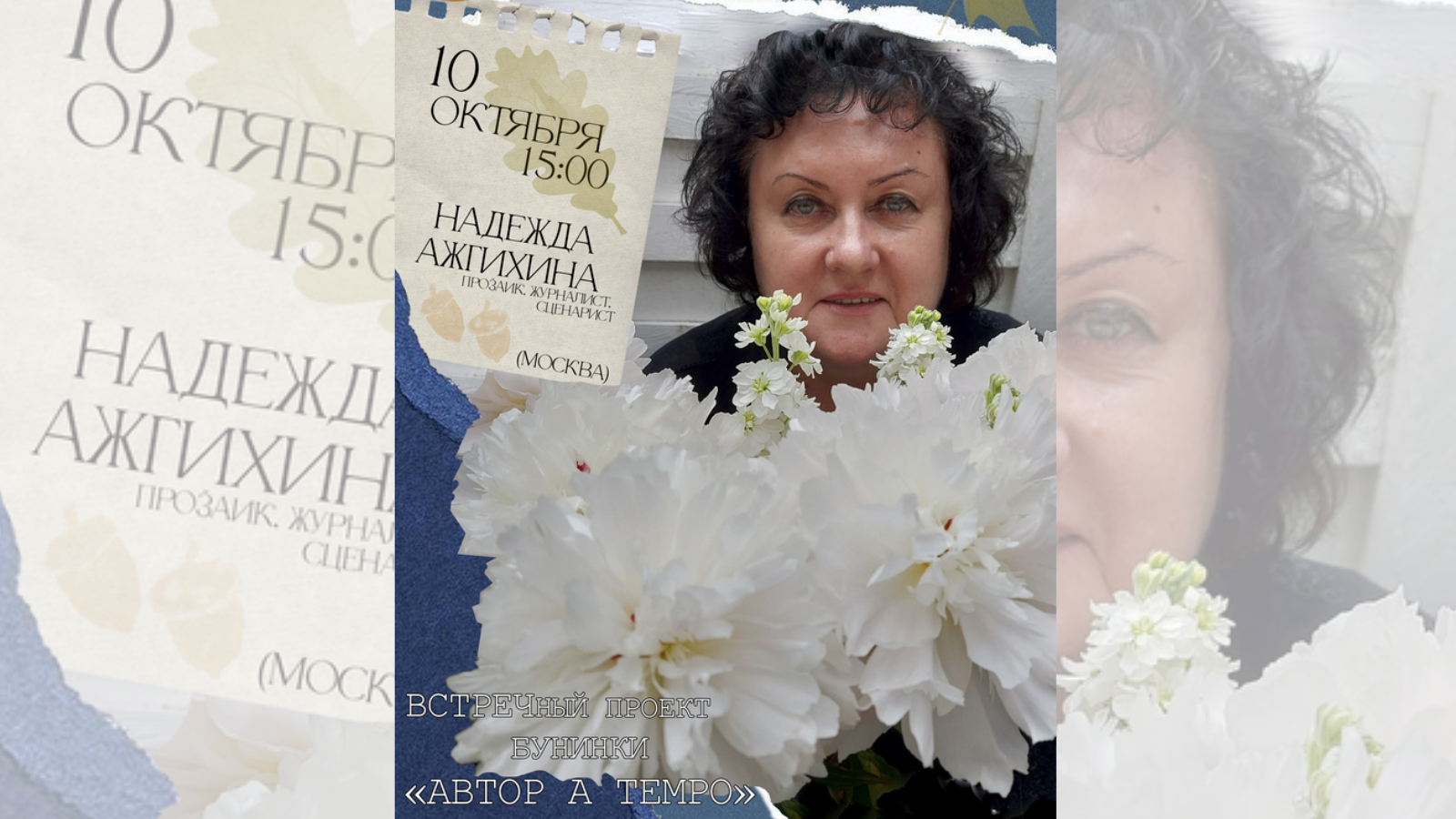 Встреча пройдет в рамках литературного проекта «Автор a tempo». Надежда Ажгихина - автор четырех книг прозы и многочисленных публицистических работ, вице-президент Европейской федерации журналистов. Ее работы публиковались в журналах «Юность», «Знамя», «Литературная газета» и многих других.