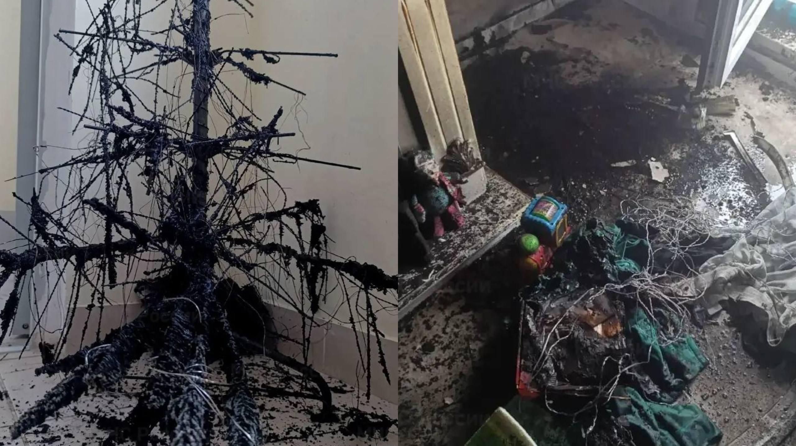 Причина пожара — предположительно, короткое замыкание гирлянды, которая украшала новогоднюю ель. Пострадавших нет.