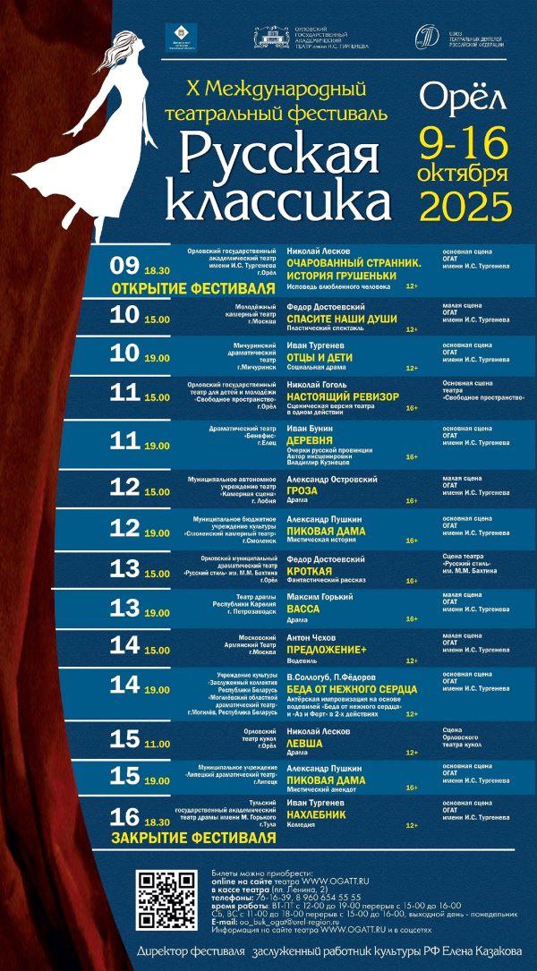 С 9 по 16 октября 2025 года в Орле пройдет X Международный театральный фестиваль «Русская классика». В фестивале примут участие коллективы из Москвы, Минска, Рязани, Смоленска, Тулы и других городов.