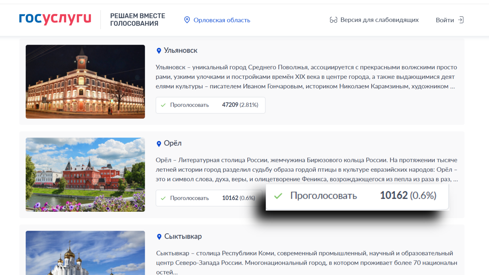 Сейчас же продолжается Народное голосование, которое открыто для всех городов-участников. На сегодняшний день свой голос отдали более 1,6 млн человек. Однако Орел значительно уступает городам-лидерам. Сейчас за областной центр проголосовали чуть более 10 тысяч человек, что составляет лишь 0,6% от общего числа участников. Абсолютным же лидером Народного голосования является Новосибирск, набравший более 22% голосов.