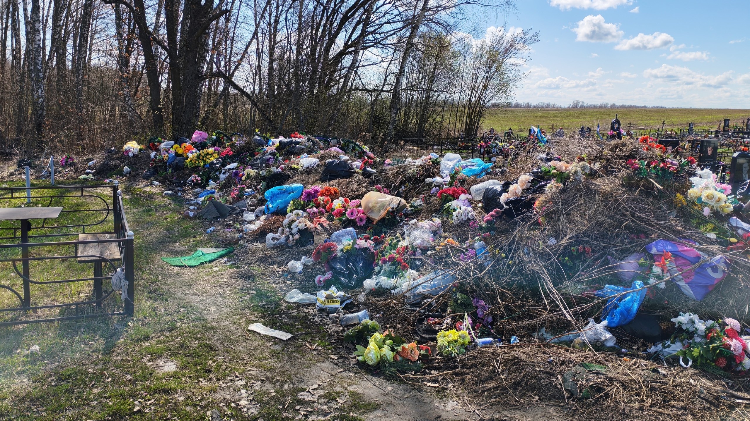 Однако, судя по кадрам, вместо этого мусор продолжительное время уже не вывозится, а сама территория кладбища начала обрастать внушительной «стеной» из отходов.