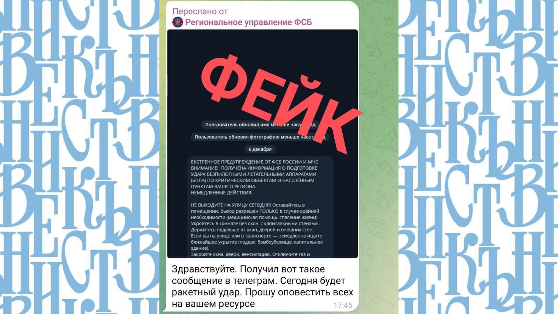 Сегодня некоторые жители региона получили сообщения от якобы официального аккаунта «Региональное управление ФСБ». В нем сообщалось о том, что ФСБ России и МЧС России предупреждают о подготовке удара БПЛА по критическим объектам и населенным пунктам региона и призывают не выходить из дома без крайней необходимости.