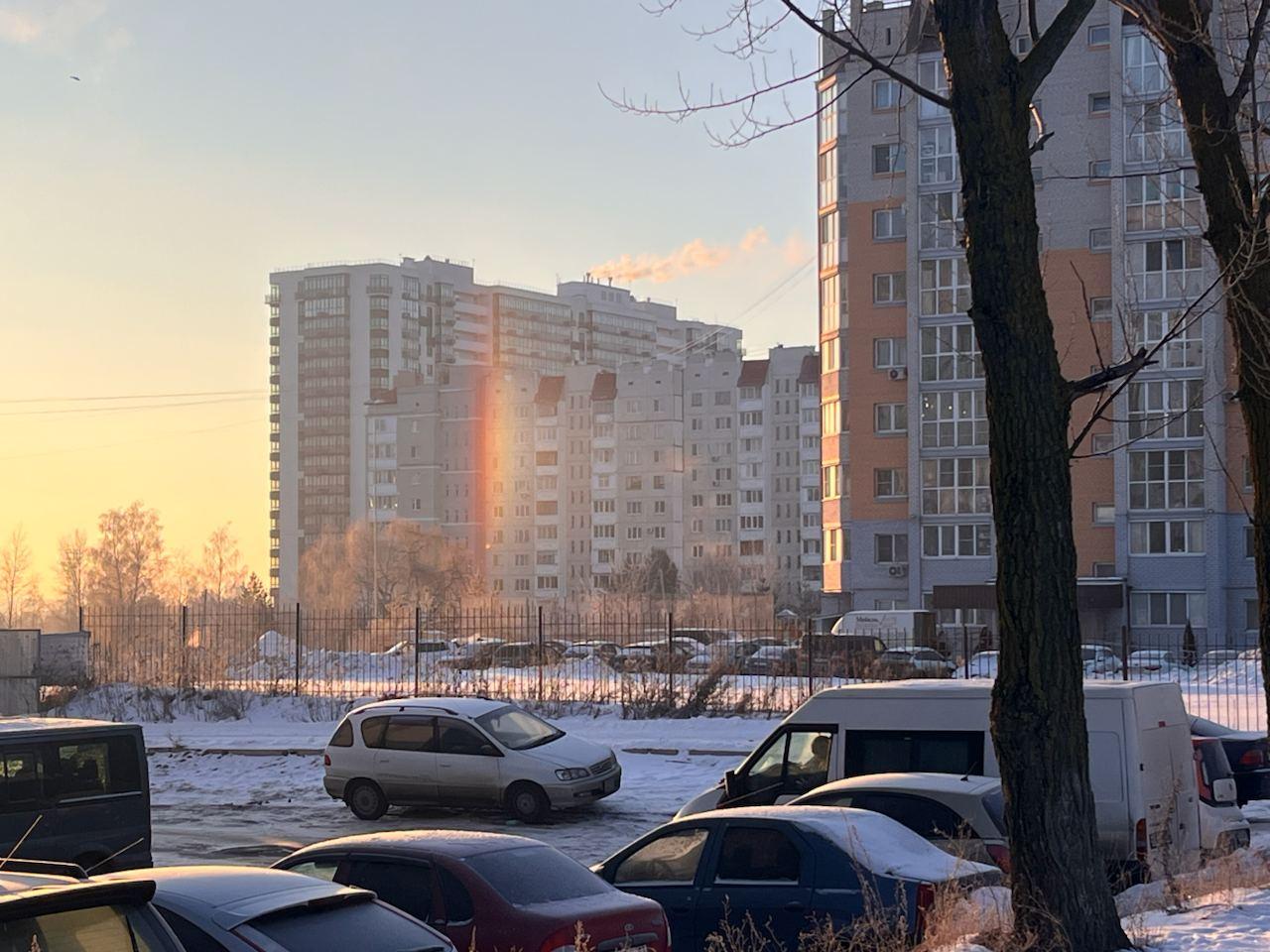 Снимки были сделаны сегодня утром, 24 января, в районе улицы Генерала Родина. На них видно светлое кольцо вокруг солнца, созданное преломлением света в ледяных кристаллах.