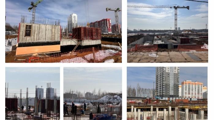 В пятой и шестой секциях завершено перекрытие цокольного этажа, забетонированы лестничные клетки и лифтовые шахты. В пятой секции заканчивают бетонирование вертикальных конструкций первого этажа, в шестой — армируют стены и колонны.