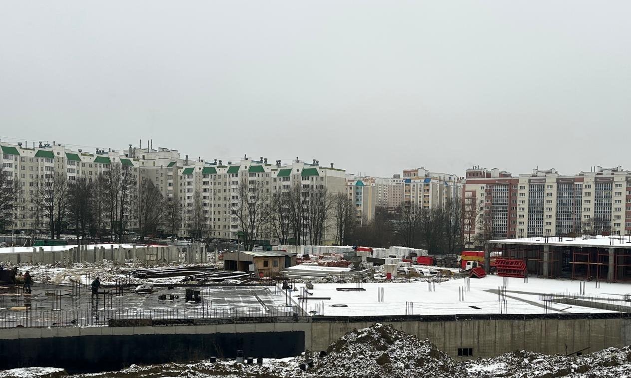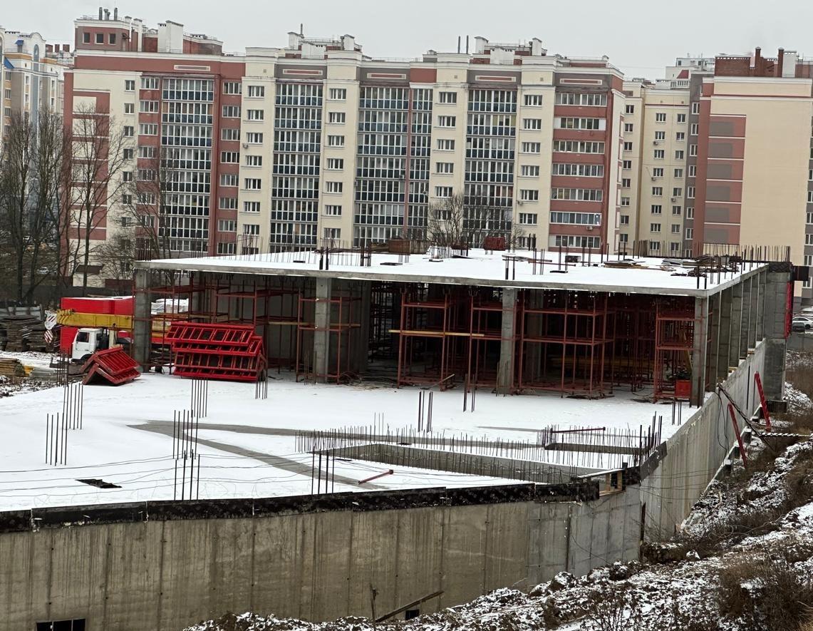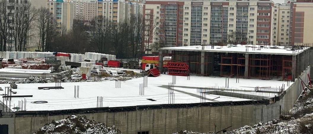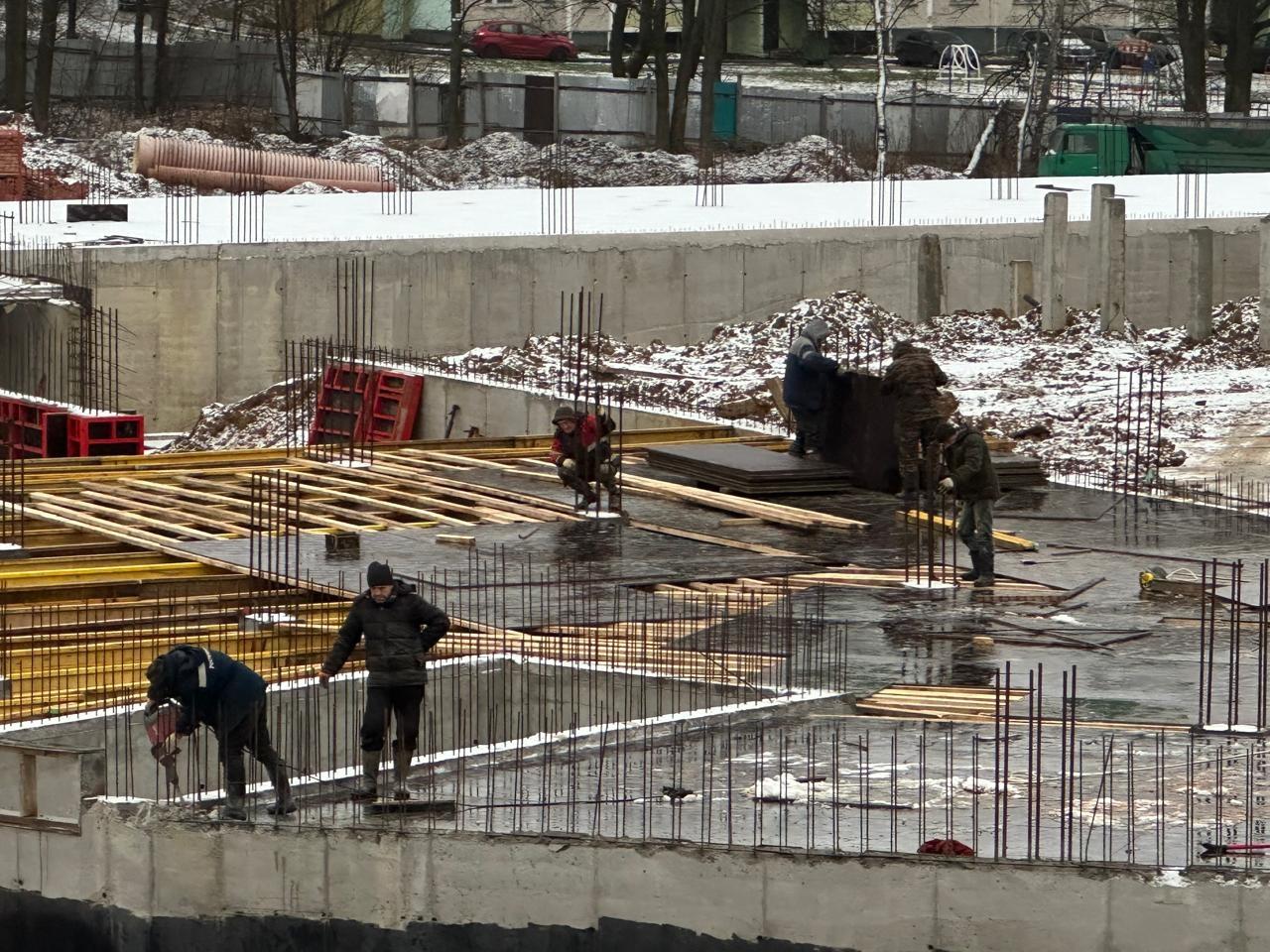Строители приступили к возведению железобетонного каркаса стен и колонн первого этажа на втором блоке. Подрядчик также занимается гидроизоляцией наружных стен цокольного этажа. Ведутся работы по устройству опалубки и армированию плиты перекрытия цокольного этажа на третьем блоке.
