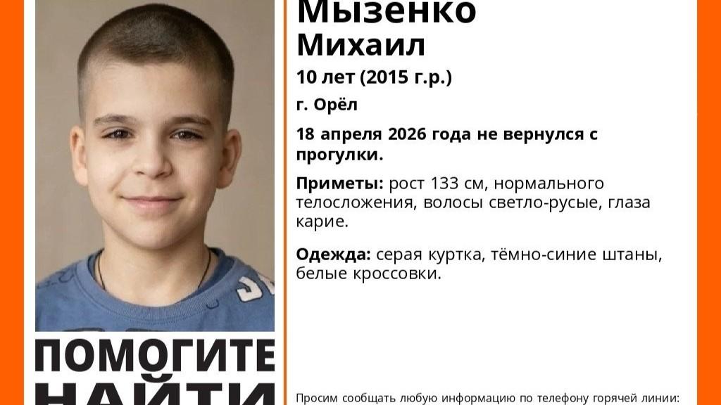 В Орле пропал 10-летний Михаил Мызенко. 18 апреля он ушел на прогулку и не вернулся. Поисковый отряд «ЛизаАлерт» опубликовал ориентировку. Приметы: рост 133 см, нормальное телосложение, светло-русые волосы, карие глаза. Был одет в серую куртку, темно-синие штаны и белые кроссовки.