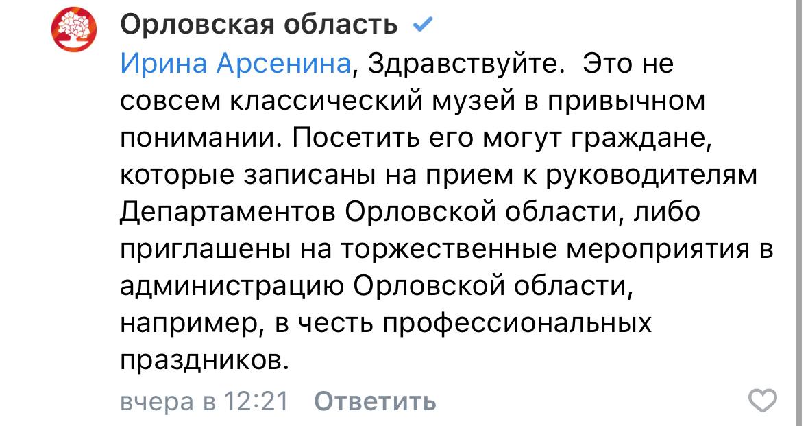 Также в социальных сетях «Орелтаймс» появился комментарий от пресс-службы администрации, который подтвердил абсурдность ситуации: «Это не совсем классический музей в привычном понимании. Посетить его могут граждане, которые записаны на прием к руководителям департаментов Орловской области, либо приглашены на торжественные мероприятия в администрацию Орловской области, например, в честь профессиональных праздников».