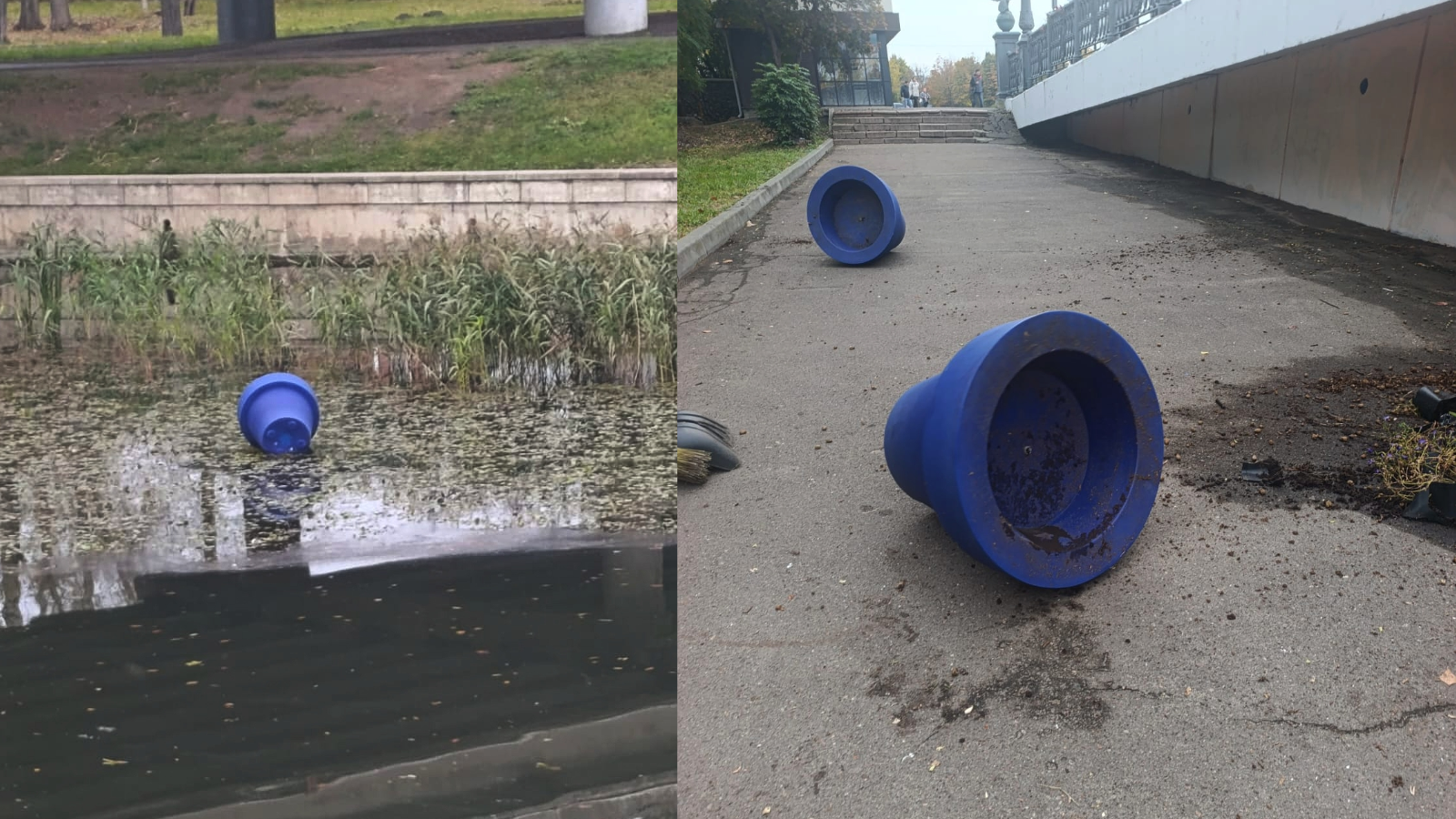 Печальная находка ожидала коммунальщиков в среду утром - три массивных цветочных вазона, украшавших Александровский мост, пропали. Отправившись на их поиски, сотрудники обнаружили два вазона под мостом со стороны сквера Маяковского, третий же запутался в камышах под аркой Тургеневского моста.