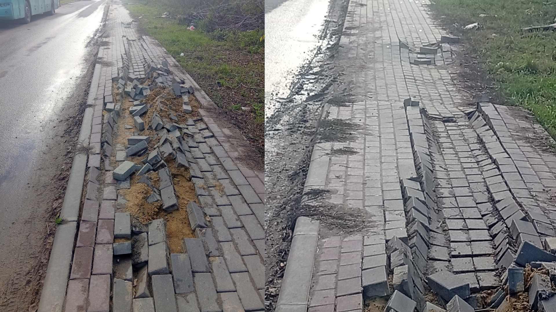 В Орле в районе Наугорского шоссе идет активная застройка – грузовые машины ездят не только по проезжей части, но и по тротуарам. Плитка на пешеходной дорожке не выдерживает такой и нагрузки и идет волнами.