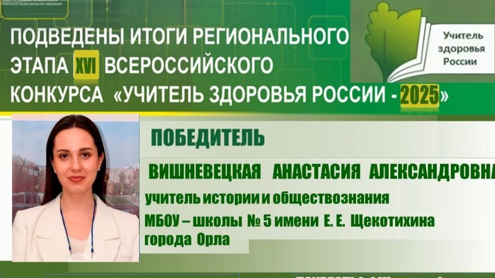 Преподаватель истории и обществознания из орловской школы № 5 имени Е.Е. Щекотихиной Анастасия Вишневецкая стала победителем регионального этапа Всероссийского конкурса «Учитель здоровья России – 2025». Она отправится на финальный тур, проходящий в Йошкар-Оле с 26 по 28 ноября.